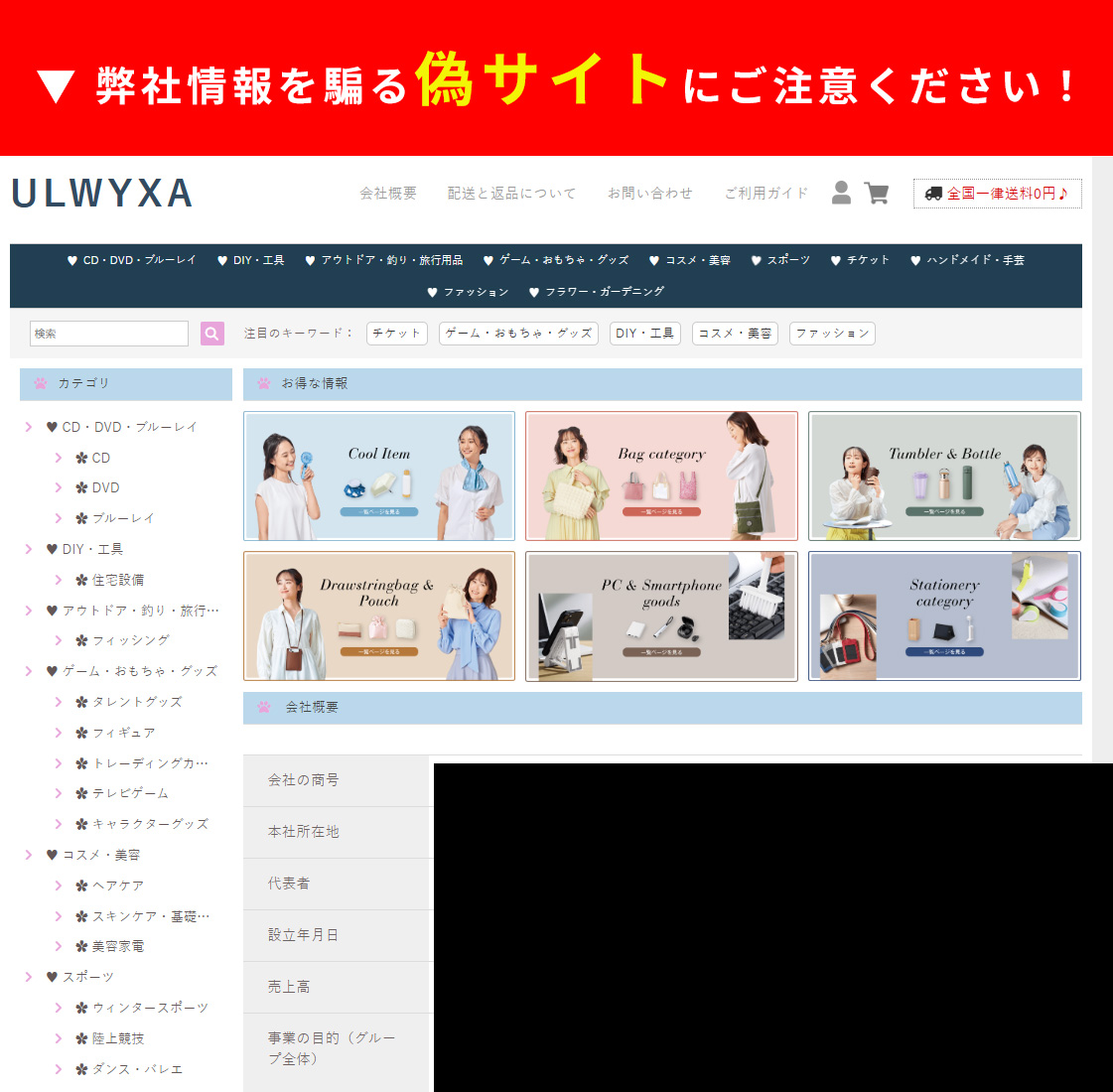 これらの偽サイトは、当社の社名や情報を無断で使用し、あたかも当社のサイトであるかのように装っていますが、